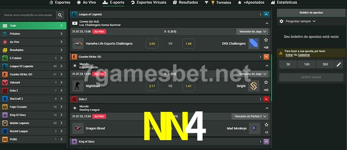 O NN4 oferece uma grande seleção de opções de apostas em e-sports com probabilidades competitivas